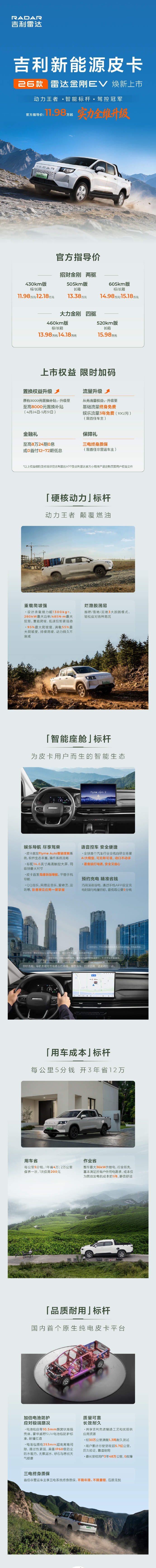 IT之家 4 月 24 日消息,在今天(4 月 24 日)开幕的北京国际车展上,2026 款吉利雷达金刚 EV 正式上市,官方指导价 11.98 万元起。